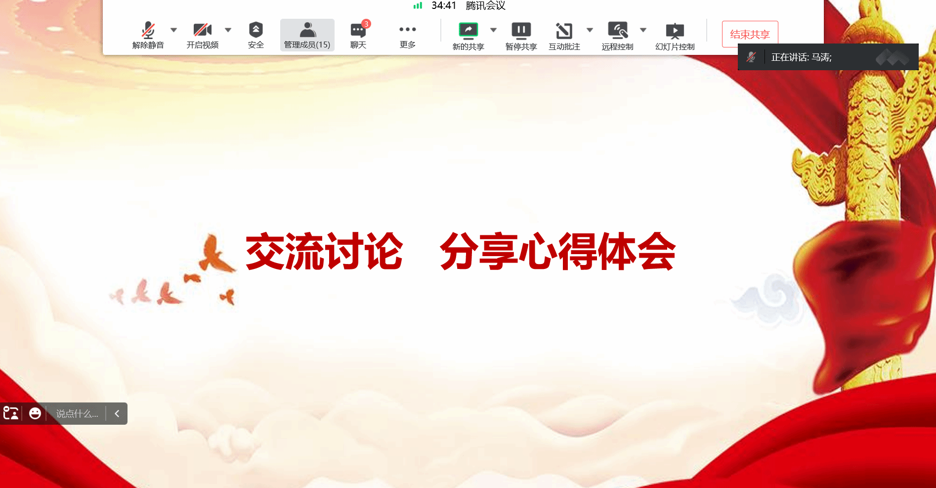 第三项由宣传委员周文娟带领大家集中学习习近平总书记视察安阳重要讲话精神--《红旗渠精神同延安精神一脉相承,永远震撼人内心》。红旗渠记载了林县人不认命、不服输、敢于战天斗地的英雄气概,同延安精神是一脉相承的,是中华民族不可磨灭的历史记忆,要继承和发扬吃苦耐劳、自力更生、艰苦奋斗的精神,摒弃骄娇二气,像我们的父辈一样把青春热血镌刻在历史的丰碑上。