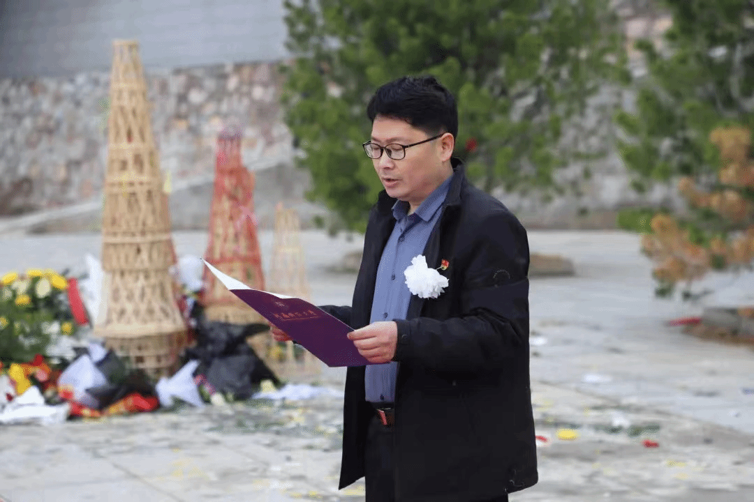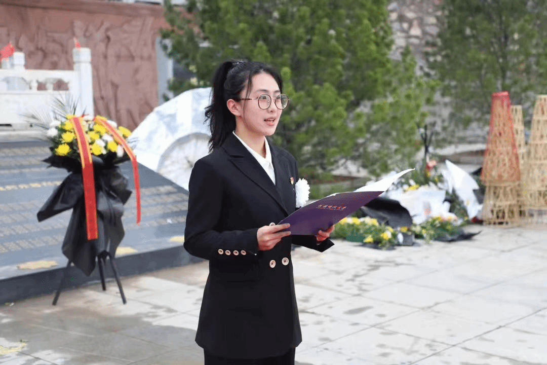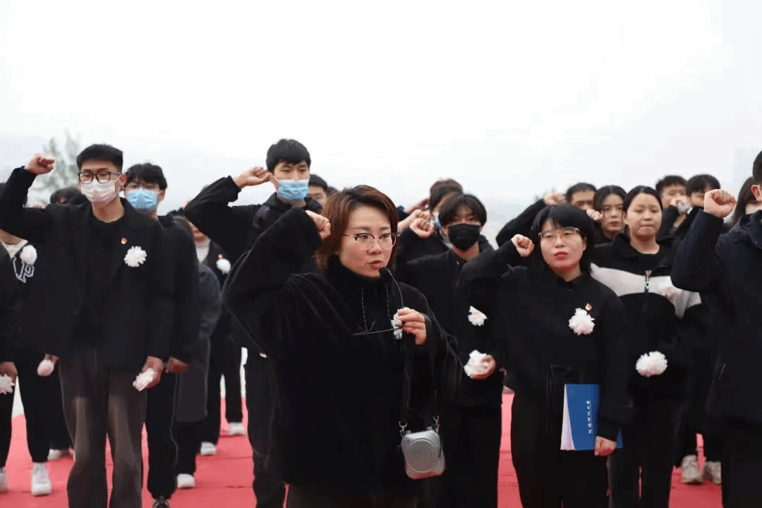 全体师生代表在纪念碑前静立默哀,向烈士纪念碑敬献花篮。在庄严肃穆的氛围中,全体师生依次缓步上前向烈士纪念碑敬献鲜花,鞠躬致敬,表达对革命先烈的追思和敬仰。教师代表和学生代表发言后,全体师生在尤佳丽带领下重温入党誓词。