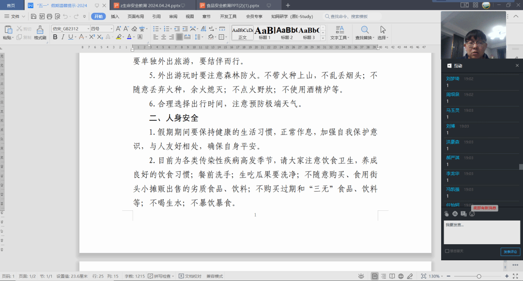 班会采用线上线下两种形式。各辅导员从出行安全、人身安全、财产安全和校园安全等多个方面做出强调。就出行安全,重点强调四点:1.保持手机畅通,告知出行地点和计划;2.避免非法运营和危险车辆,严禁无证驾驶;3.遵守交通规则,注意驾驶安全;4.外出时注意健康和安全,避免单独行动。就人身安全,强调三点:1.保持健康生活习惯,注意饮食卫生;2.避免人群密集场所,防止意外事故;3.不私自下水游泳,注意水域安全。财产安全强调两点:1.注意保管财物,避免携带大量现金或贵重物品;2.防范偷窃和信息泄露,不轻信陌生人;3.培养节约意识,避免不良消费和诈骗。校园安全强调两点:1.妥善保管贵重物品,关闭门窗和电源;2.遵守校规校纪,注意宿舍和实验室安全。辅导员们向同学们介绍了必要的安全技能,提升学生遇到突发紧急安全情况时的应急处置能力