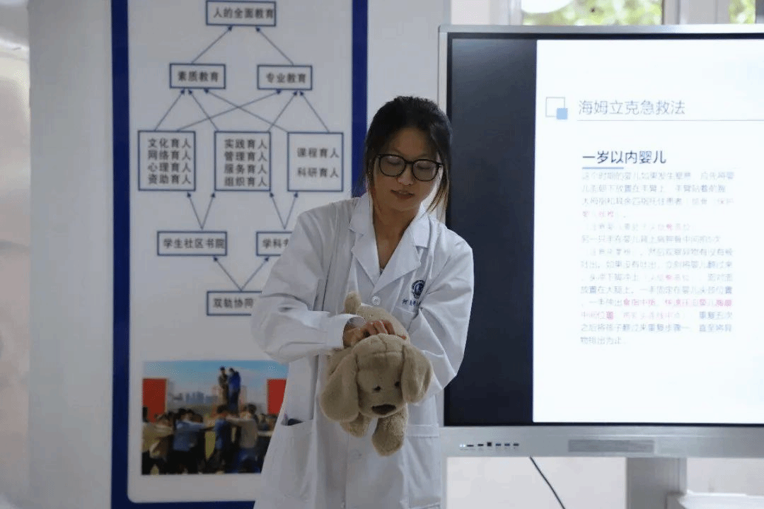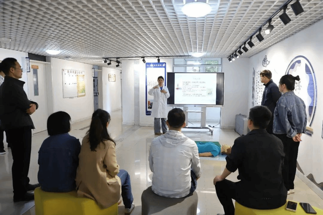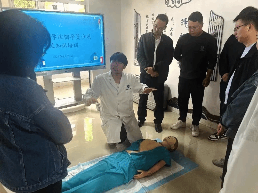 学院临床专业、护理专业志愿者通过图文结合的形式向在场辅导员讲述了部分常见伤情的表现及注意事项,且针对大学生群体重点讲解了骨折、烧伤等常见突发状况。在志愿者对急救方式的示范下,辅导员们具体学习了心肺复苏、海克立姆急救法、压迫止血等急救方法,并重点练习了心肺复苏中“胸外心脏按压——释放气道——人工呼吸”三个步骤的关键动作。在现场演练环节中,辅导员们积极参与,用心体会操作要领,力争做到准确、规范、精准地掌握应急救护技能。