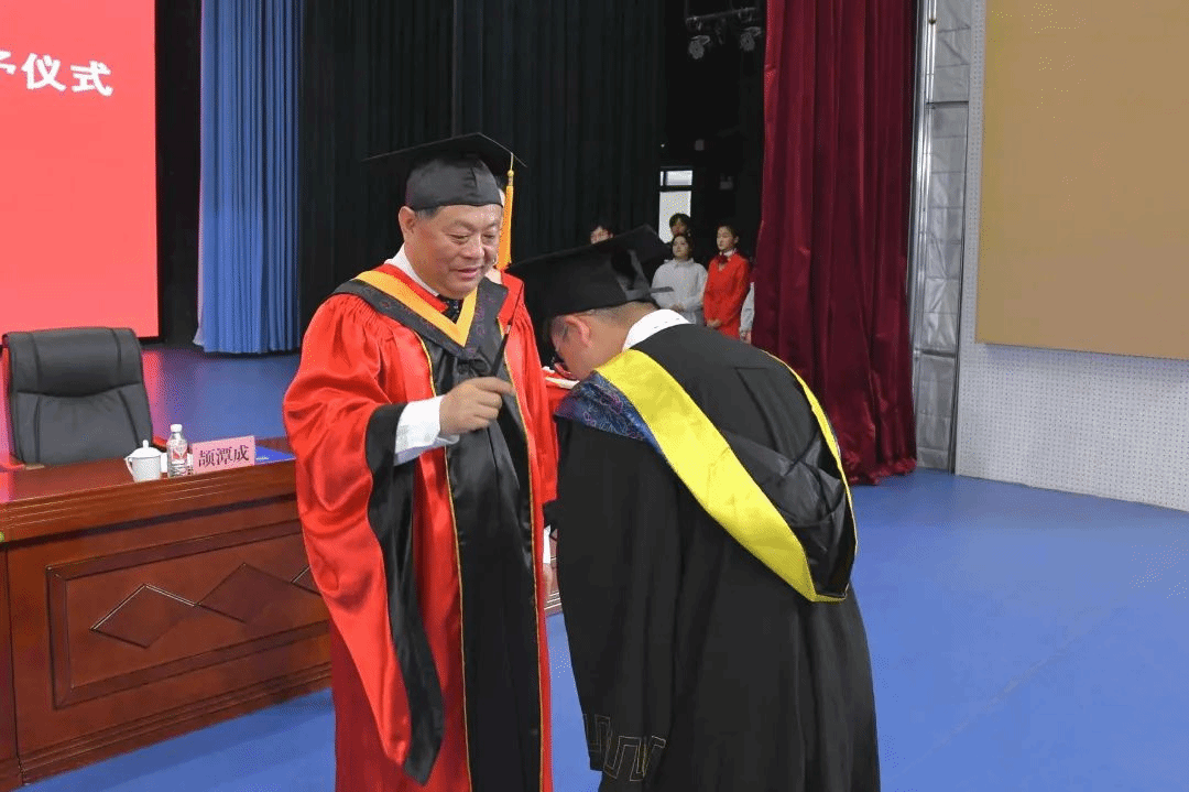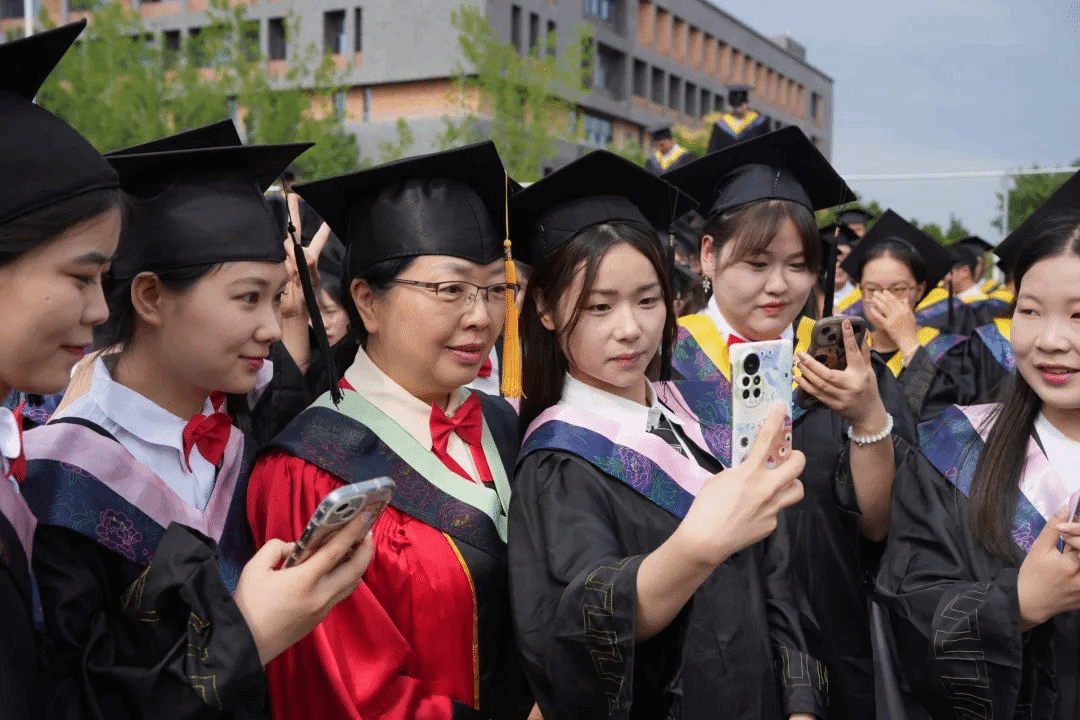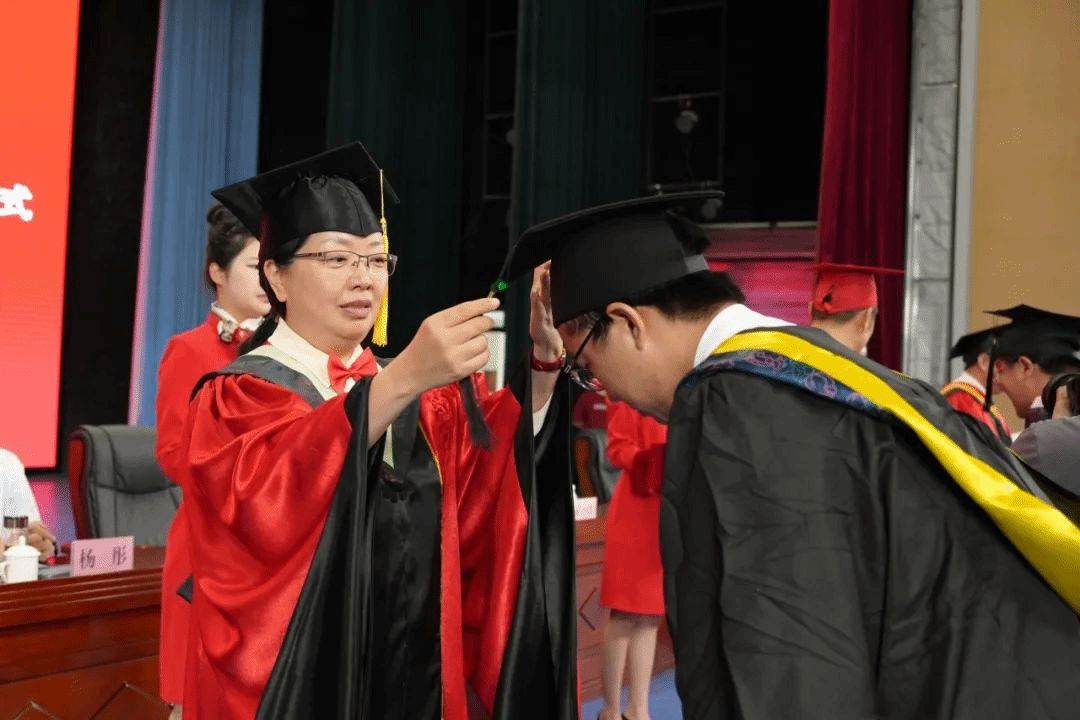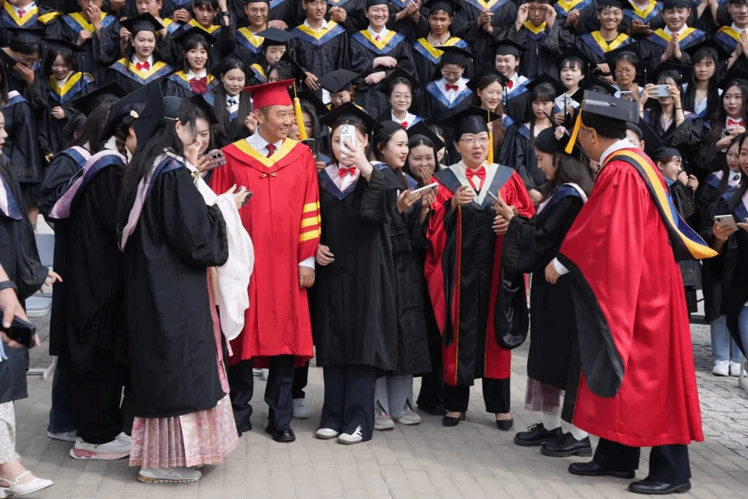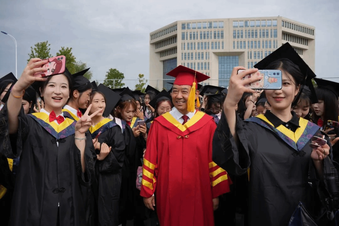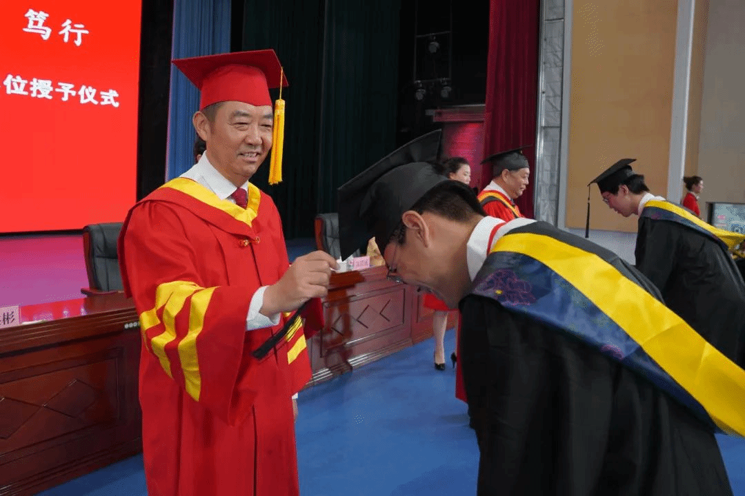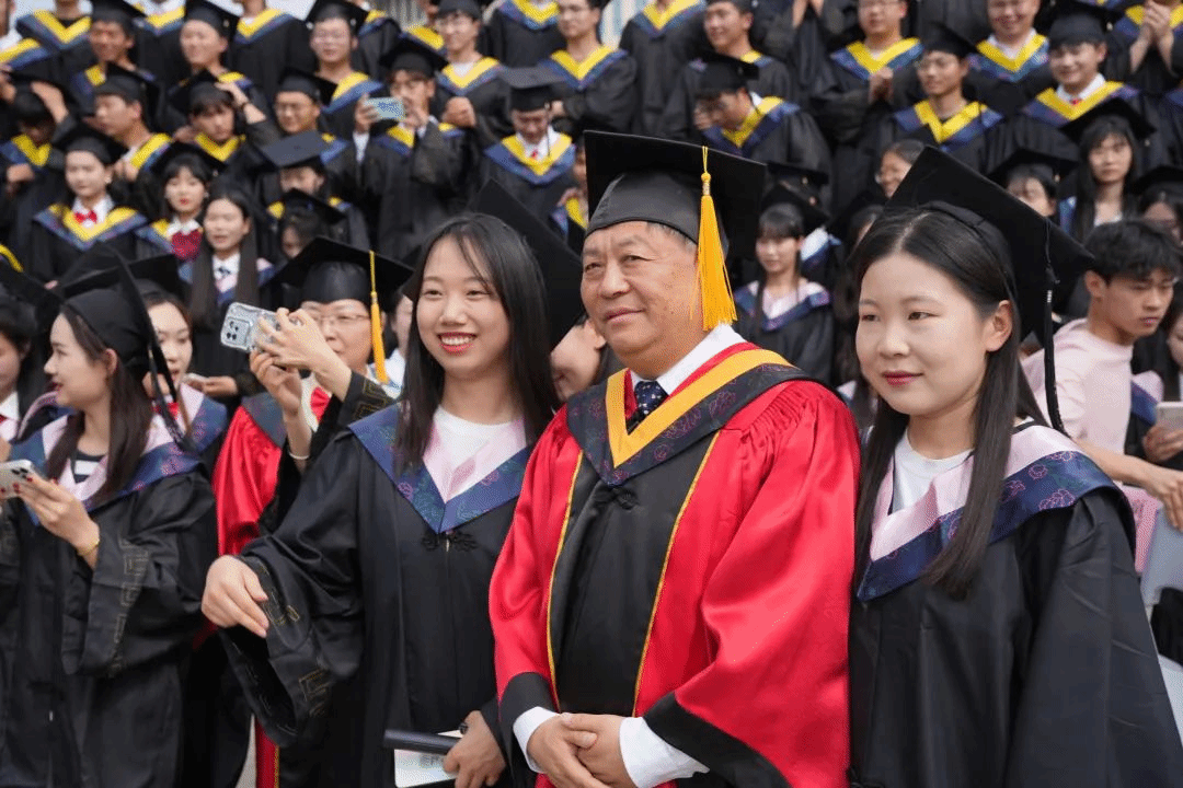 王洪彬、侯小改、颉潭成为获得学士学位的毕业生们正冠拨穗,授予学位,并合影留念。