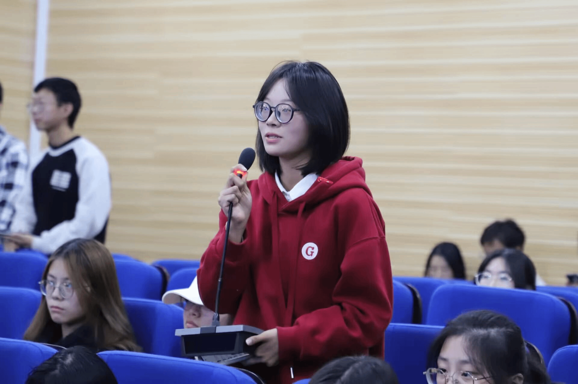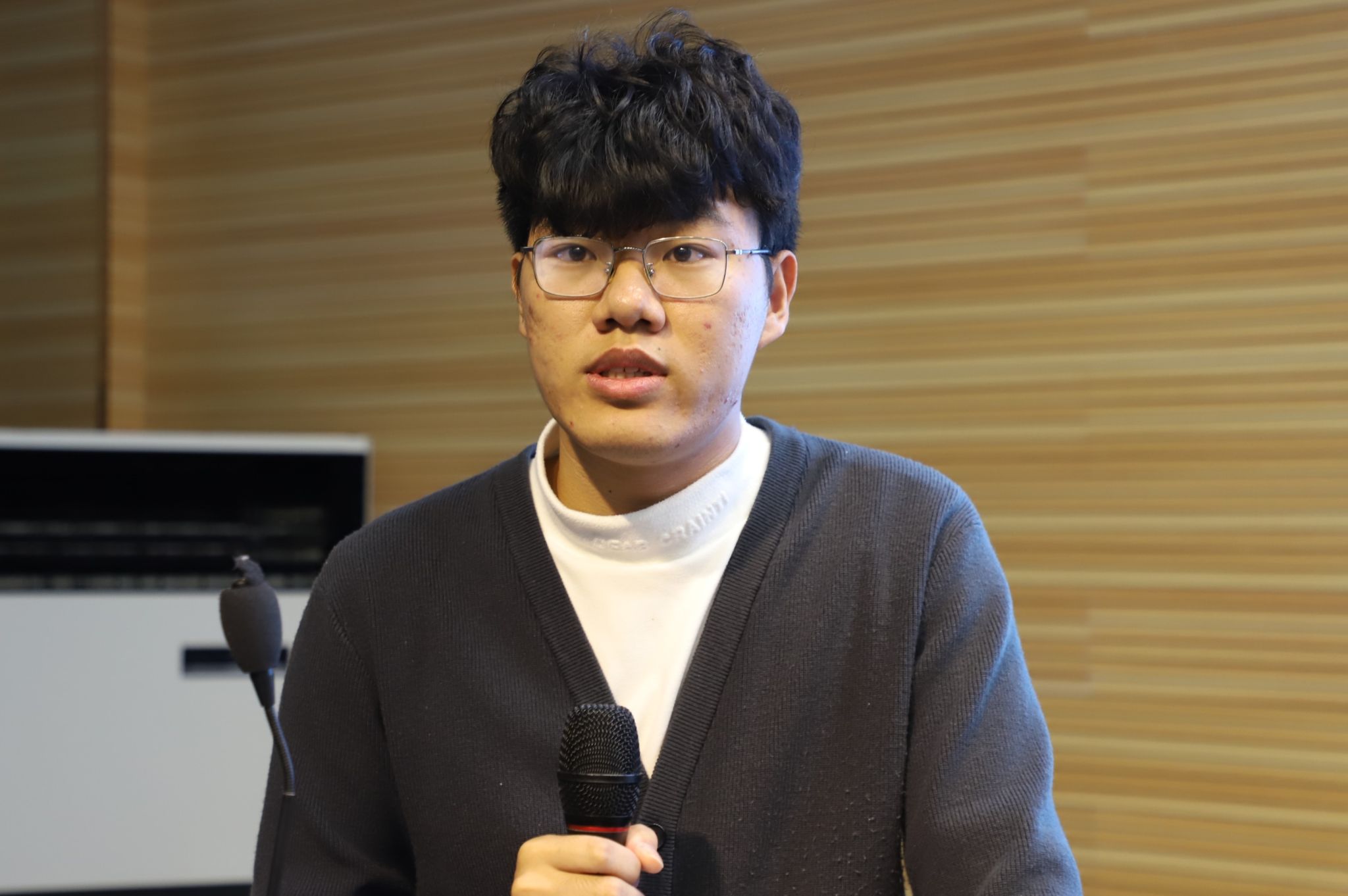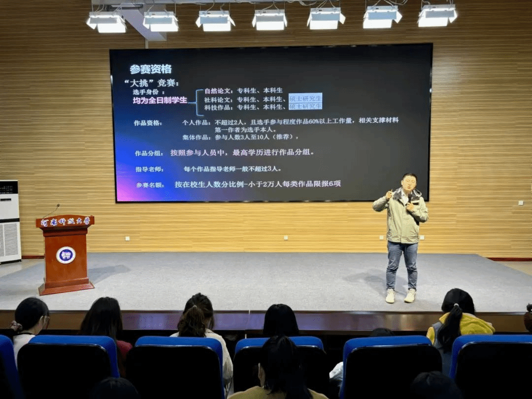 随后,由优秀参赛选手仓文豪和李欣雨分别上台分享他们的参赛经验。两位选手从自身出发,以PPT形式展示了参赛应当注意的细节问题,并从团队组成、项目设计、答辩技巧等方面对同学们进行提醒与引导,鼓励同学们勇敢参与比赛,增强其自信心。