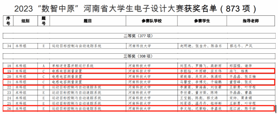 2023“数智中原”河南省大学生电子设计大赛是由河南省教育厅主办高规格赛事,比赛设有高职高专、本科、研究生三个组,主要包括“理论设计”和“实际制作”两部分,以电子电路(含模拟和数字电路)设计应用为基础,可以涉及模-数混合电路、单片机、嵌入式系统、DSP、可编程器件、EDA 软件、互联网+、大数据、人工智能、超高频及光学红外器件等的应用。经学校推荐、专家组评审、组委会审核,最终产生一等奖188项,二等奖377项,三等奖308项。