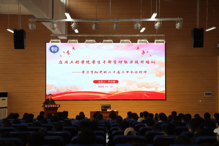 齐天锋围绕党的二十届三中全会精神为学生干部开展管理能力提升培训。首先,他向学生干部讲解了全会的主要内容,指出学生干部要深刻领会“六个必然要求”、“七个聚焦”、“六个坚持”、“十四方面”等指导思想,学习全会所体现出来的坚定决心、明确目标、守正创新、担当作为等优秀品质。接着,他以全会在新征程上高举改革开放的伟大旗帜,坚定走中国式现代化道路为例,呼吁学生干部在工作中要坚持问题导向,勇于创新实践,保持艰苦奋斗、无私奉献的精神,推动学院工作顺利开展。